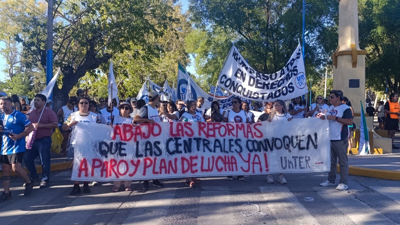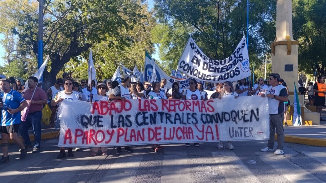 El primer turno fue en Viedma. Mientras Weretilneck conseguía en la Legislatura el apoyo de toda la oposición —incluido el peronismo— para aprobar un Presupuesto 2026 de ajuste, en las calles se realizaba una concentración de unas 600 personas convocada por las tres centrales sindicales. Participaron sindicatos de la CGT y las CTA, junto a ASSPUR, sectores estudiantiles, jubilados, ambientalistas. Las conducciones leyeron un documento único que denunció la reforma laboral, aunque sin mencionar el paro nacional.