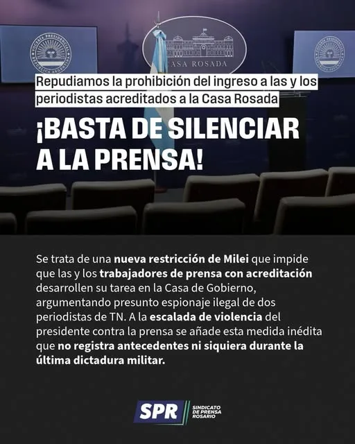 El Sindicato de Prensa Rosario expresó su enérgico repudio ante la decisión del presidente Javier Milei de restringir el acceso de periodistas acreditados a la Casa Rosada. Según el gremio, la medida constituye un serio retroceso para la libertad de prensa en Argentina.